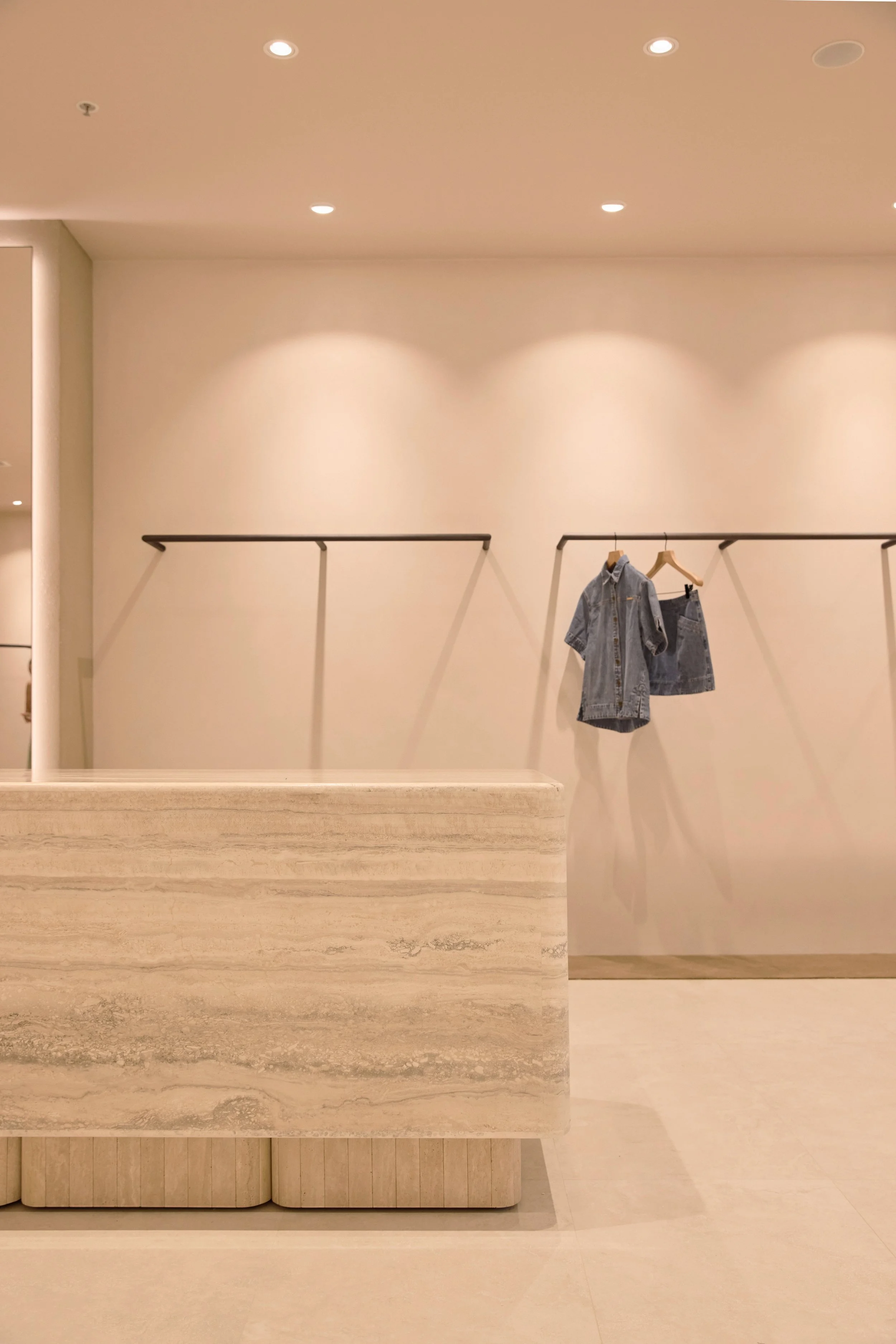The space looks to create a customer journey through the space and is centred around the organic form of the custom designed sofa in the fitting room area. The brand’s beach tonality is carried through the material selections in the space and continues the aesthetic across the brand store development.